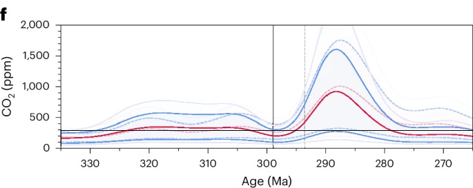 The CO2 concentrations were reconstructed from boron isotopic ratios using additional information about the isotopic composition of oxygen that relates to temperature which in turn determines CO2 solubility. The authors made two different assumptions. The solid curves in the graph (the mean (red) and the confidence intervals (blue)) indicate CO2 concentrations inferred assuming constant temperature. This assumption gives a conservative estimate of the maximum CO2 concentration. The dashed curves indicate CO2 concentrations inferred assuming a 9 K temperature rise in the early Permian, an assumption that is based on another very interesting study of Grossman, E. L. & Joakimski, M. M. (2022).