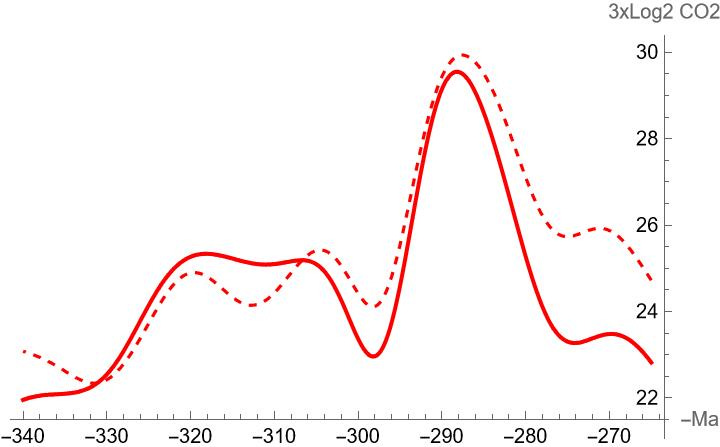 One can see that between 360 and 300 Ma when the boron-derived CO2 on average increased or at least did not change much, there was a significant decline in the planetary temperature. At around 300 Ma the temperature began to increase in phase with CO2. However, this increase in temperature continued almost monotonically until 260 Ma and beyond, while CO2 peaked at 290 Ma and dropped back to near the Ice Age concentration already by 280 Ma.