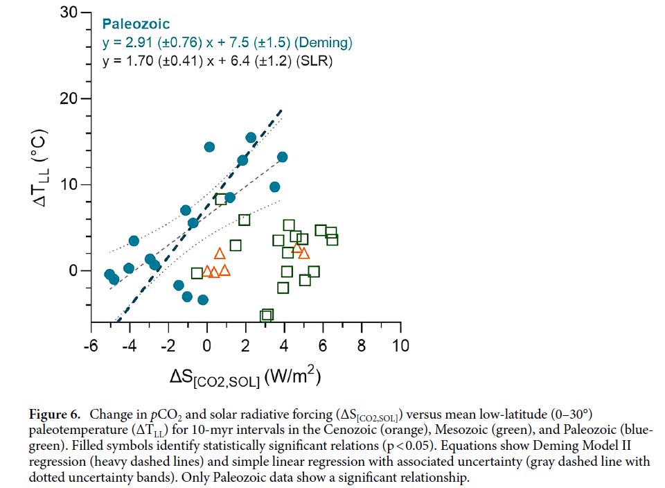 This study deserves a special mention. In the paper titled “Ocean temperatures through the Phanerozoic reassessed“ the last phrase of the abstract is “Correlations between atmospheric CO2 forcing and paleotemperature support CO2’s role as a climate driver in the Paleozoic.“ Again, if you do not read more than the abstract, you go away with your trust in the carbon dominance in climate reinforced. Meanwhile, in the paper it is also shown that unlike in the Paleozoic (541-252 Ma), there is no correlation between atmospheric CO2 forcing and paleotemperature in the Mesozoic (252-66 Ma) and the Cenozoic (66-0 Ma), as their Figure 6 below shows. Why was it not mentioned in the abstract?
